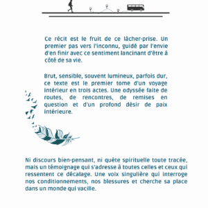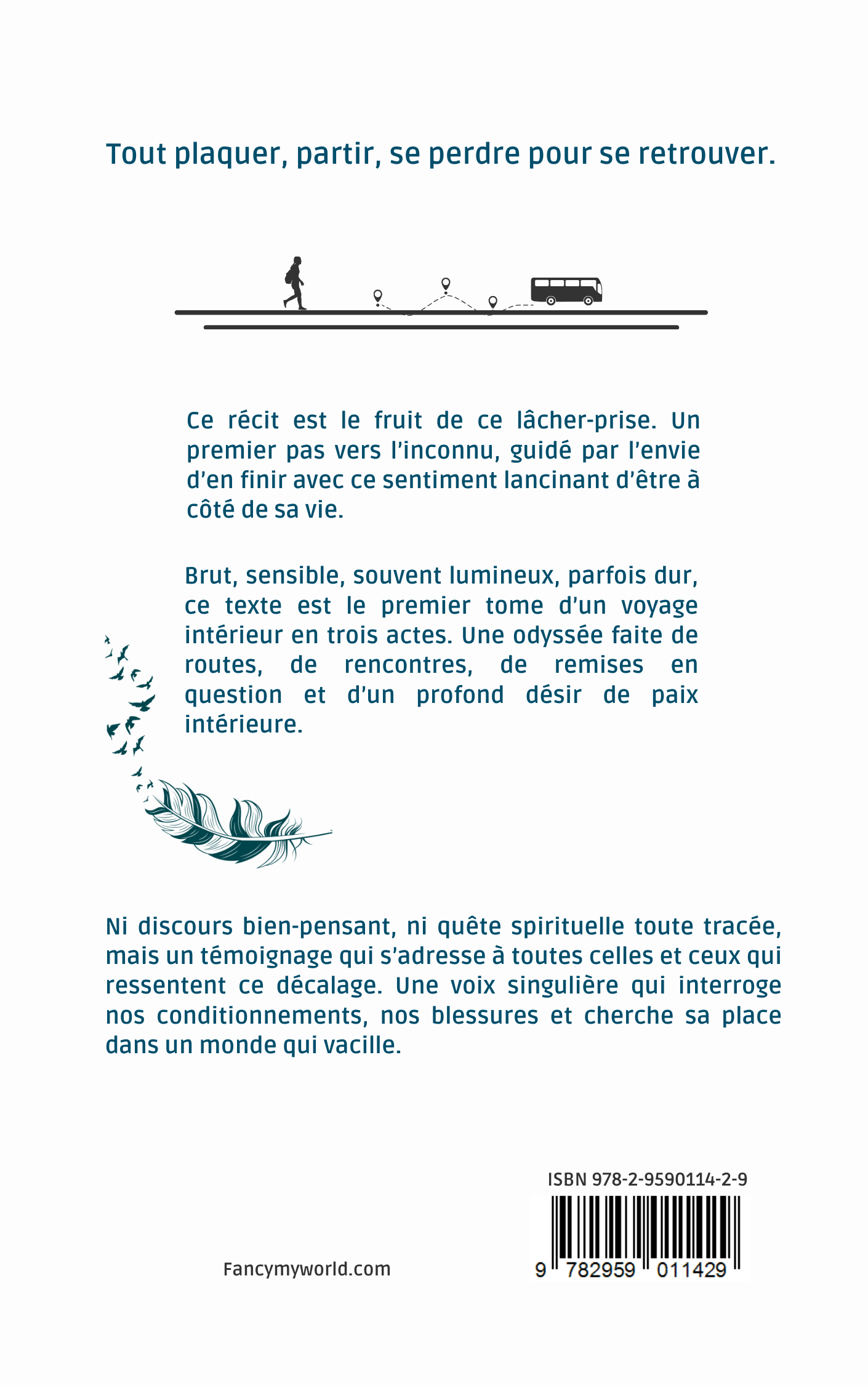 Brut, sensible, souvent lumineux, parfois dur, ce texte est le premier tome d’un voyage intérieur en trois actes. Une odyssée faite de routes, de rencontres, de remises en question et d’un profond désir de paix intérieure.